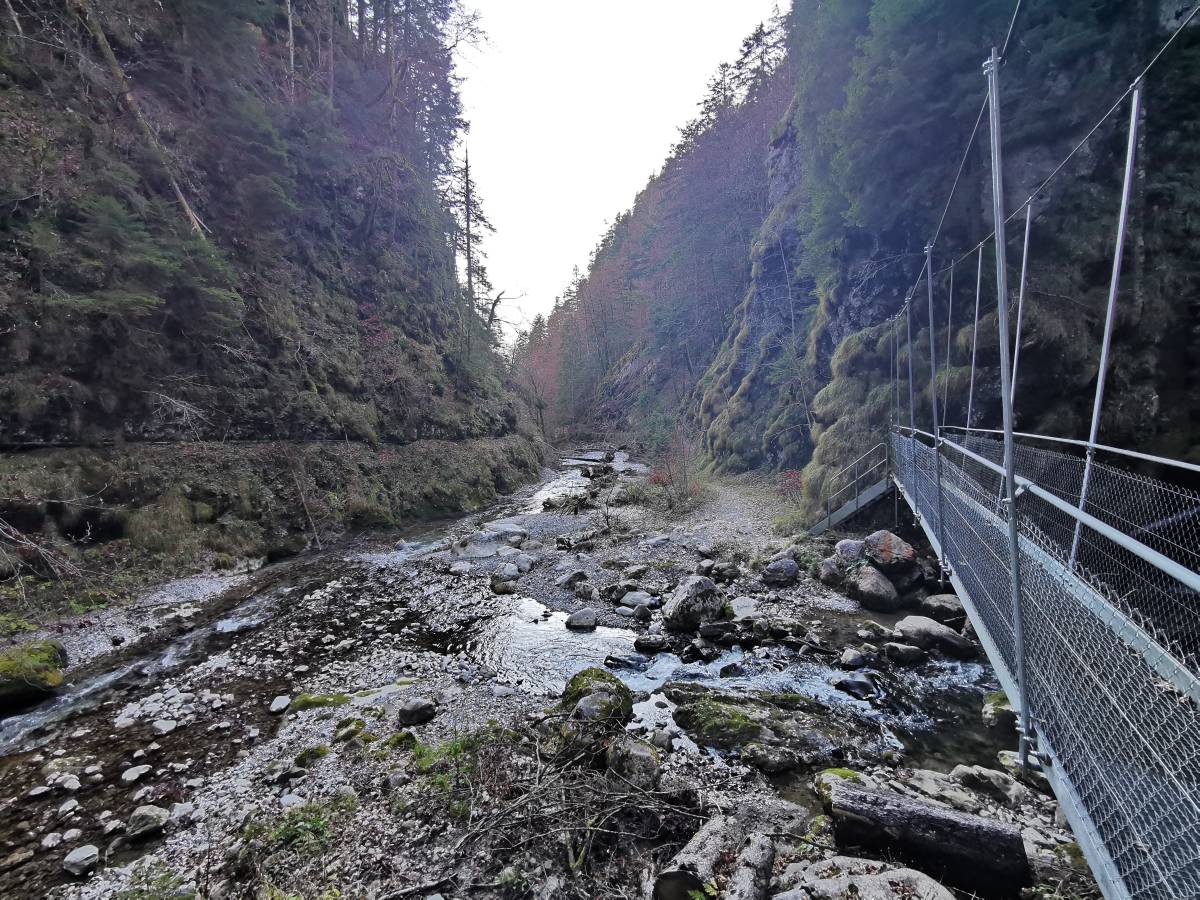 Wenige hundert Meter nach dieser Stelle war bis vor einigen Jahren Schluss mit Wandern: Buusche- und Morgetebach fliessen dort zwischen senkrechten Felswänden zusammen, die beiden Schluchten sind völlig unwegsam. Seit 2013 aber quert eine kleine Hängebrücke den Morgetebach gleich bei dessen Einmündung in den Buuschebach. Auf diese Weise gelangt man leicht und bequem auf die andere Seite der Schlucht.
