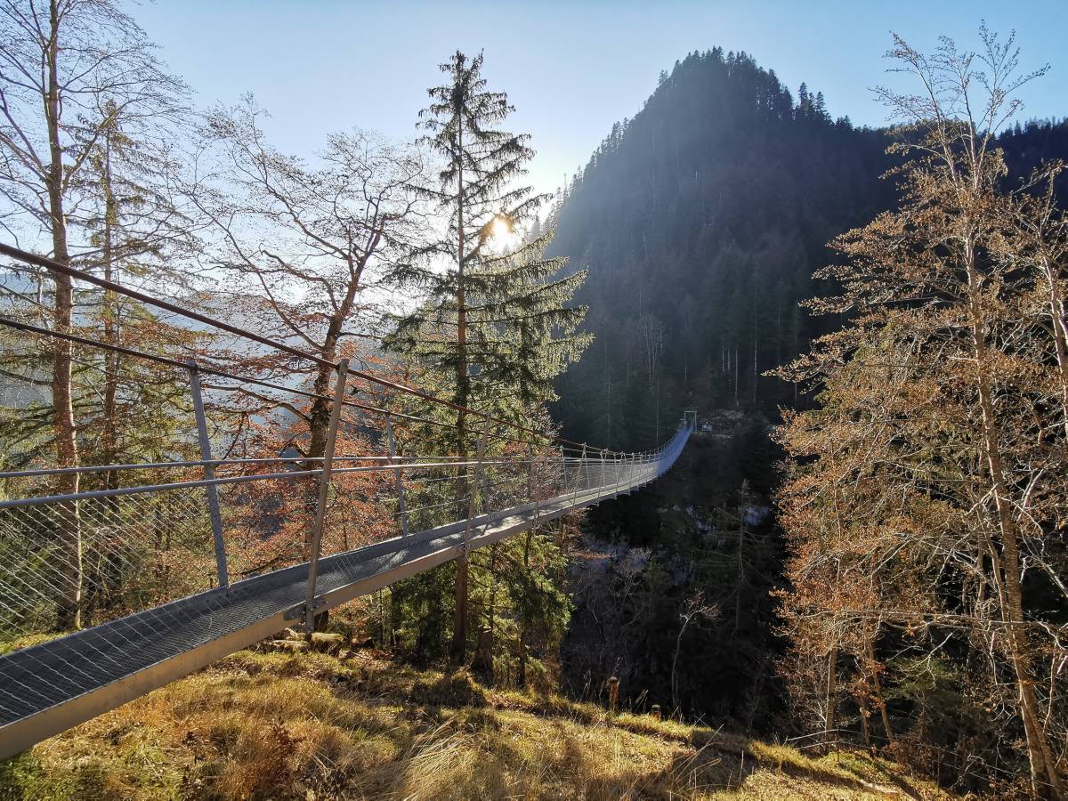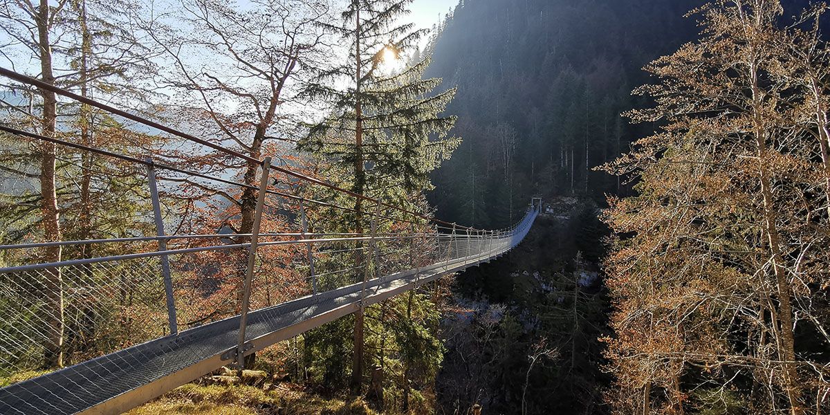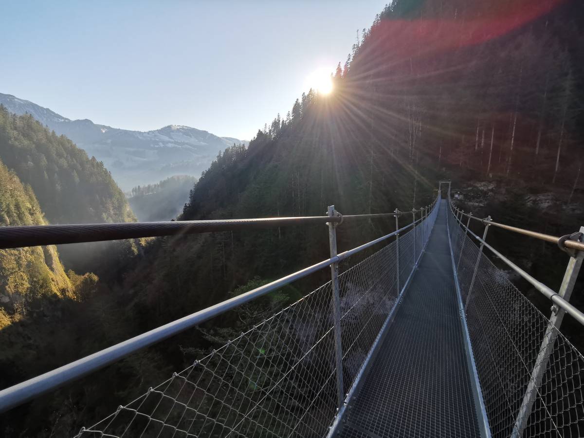 Der definitive Kick steht erst noch bevor. Der Morgetebach wird ein zweites Mal überquert – diesmal aber in ausgesprochen luftiger Höhe. Eine zweite, wesentlich grössere Hängebrücke überspannt auf einer Länge von 110 m die Schlucht und gestattet atemberaubende Tiefblicke in den grandiosen Canyon.