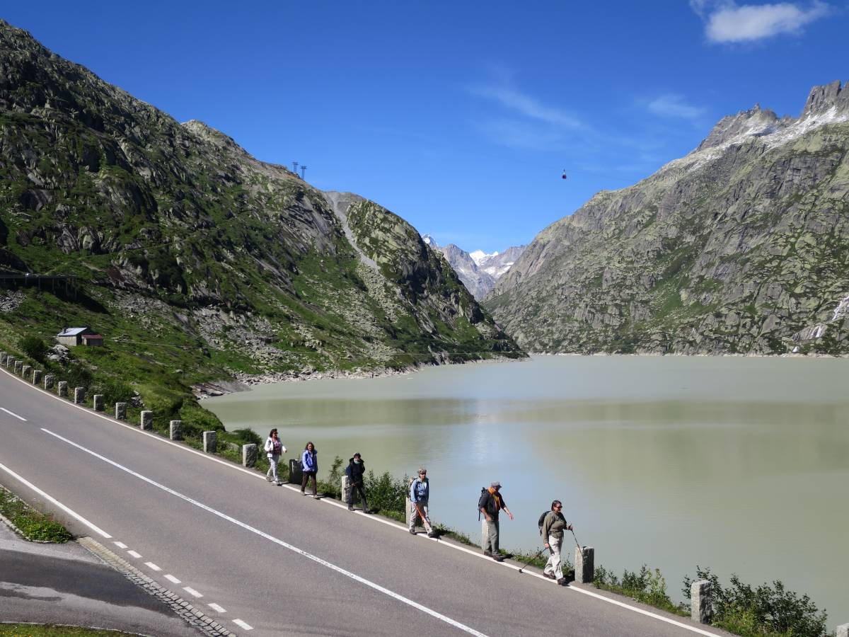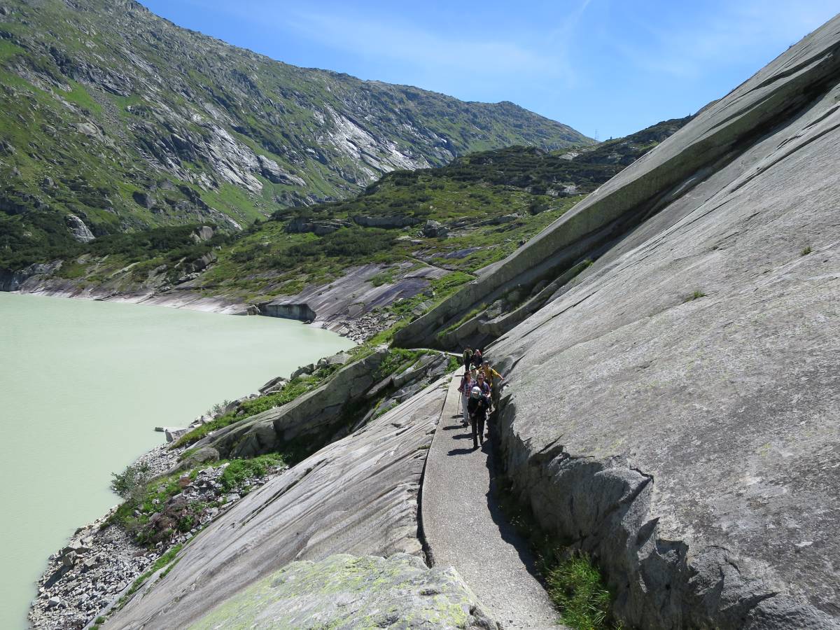 Die Höhendifferenz, die es beim Abstieg nach Guttannen zu bewältigen gilt, ist beachtlich. Die insgesamt 1100 Höhenmeter verteilen sich jedoch auf mehrere Stufen, zwischen denen es längere flache und entsprechend erholsame Abschnitte gibt. Besonders der erste Teil von der Passhöhe bis zum Grimselsee ist zudem ausgesprochen gefällearm angelegt und somit relativ gelenkschonend.