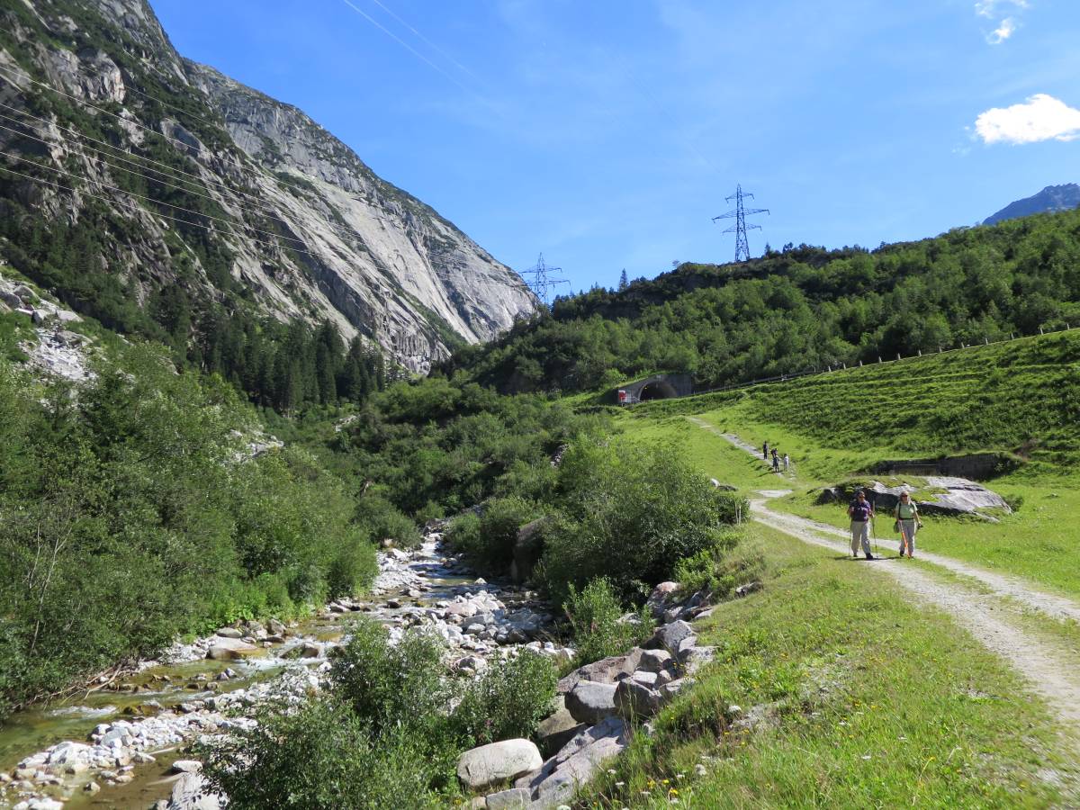 Nach dem Abstieg zur Gerstenegg folgt ein besonders schöner Abschnitt des historischen Saumpfads: Vor Jahrhunderten schon wurden an der Hälen ( = glitschigen) Platte Steinstufen in den Fels gehauen, damit die heikle Passage gefahrlos überwunden werden konnte. Von der Handegg an führt der Saumweg fast durchwegs nahe der Passstrasse talwärts. Einzig dank dem Strassentunnel bei den Stäibenden bleiben Abgasschwaden und Lärm für eine Weile verbannt. Beim Tschingelmad entfernt sich der Wanderweg von der Strasse und führt in einem grossen Bogen über die Rotlaui nach Guttannen. Auf der Brücke, welche die beiden Dorfteile Sunnsyten und Schattsyten miteinander verbindet, erblickt man nochmals die Aare, die sich hier trotz der eingeschränkten Restwassermenge bereits als respektables Gebirgsflüsschen zeigt.