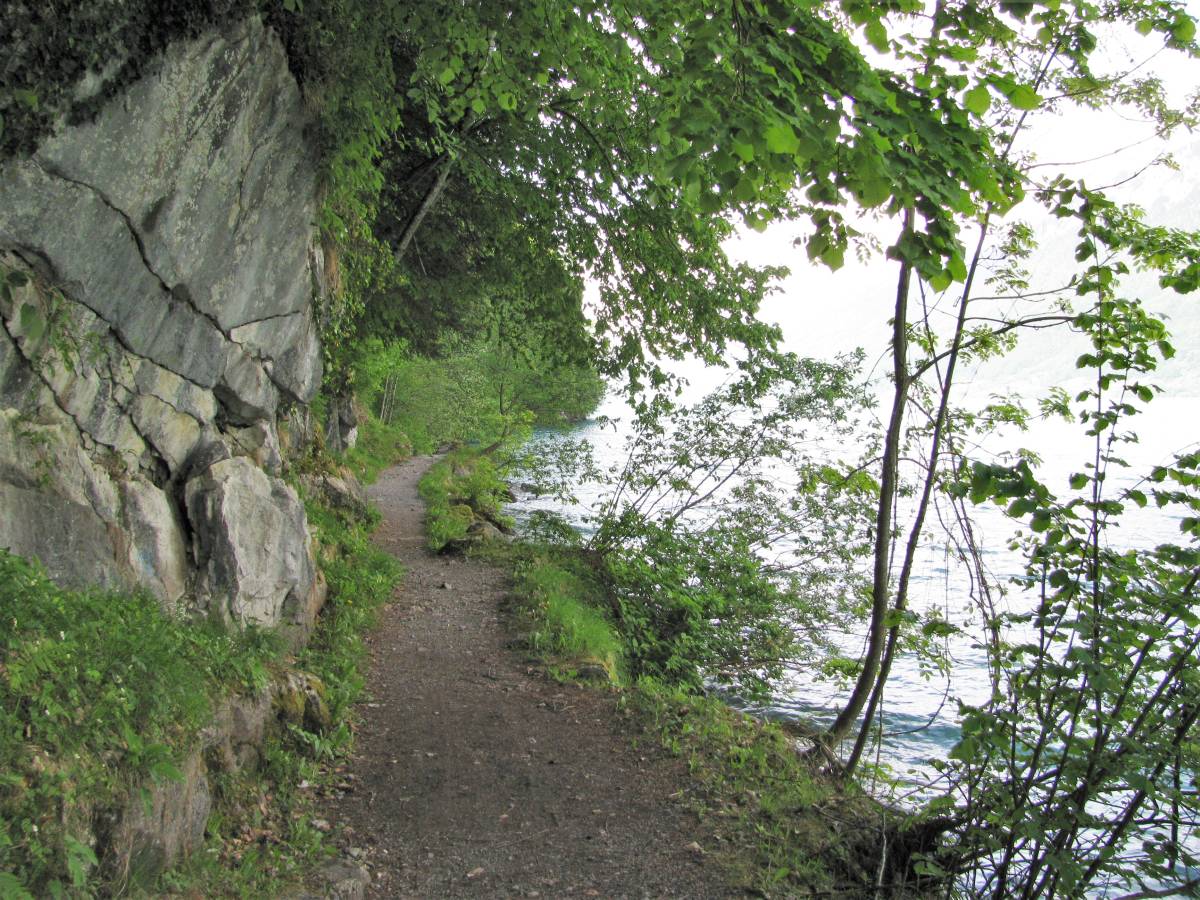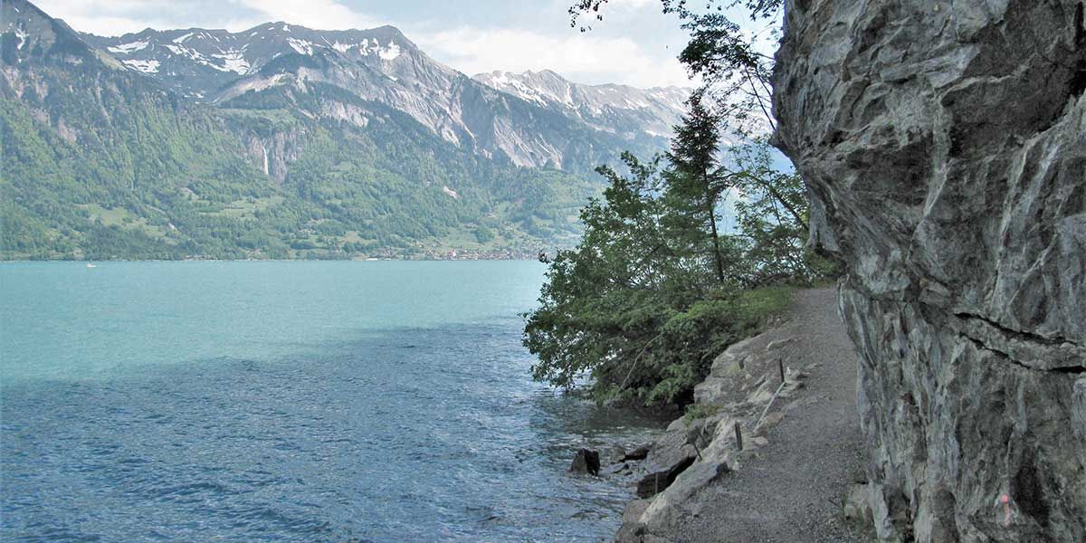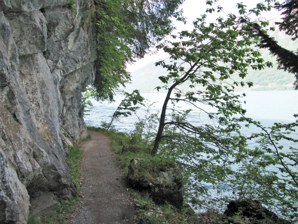 Auf der Südseite des Brienzersees gibt es eine weitere Merkwürdigkeit: Dort liegt eine überaus reizvolle Nebenwirkung des Strassenbaus. Grundsätzlich vertragen sich Strassen und Wanderwege schlecht – seit Jahrzehnten fallen immer wieder hübsche Naturwege den Asphaltmaschinen zum Opfer. Doch manchmal geht es auch anders. Als in den 1980-er Jahren der Abschnitt Interlaken-Brienz der Autobahn A8 gebaut wurde, errichtete der Kanton Bern als Kompensation für diesen Eingriff in Natur und Landschaft einen Wanderweg, der praktisch durchwegs direkt dem See entlangführt. Weil die Autobahn deutlich weiter oben und zudem auf längeren Strecken in Tunnels verläuft, stören weder Lärm noch Abgase den Wandergenuss.