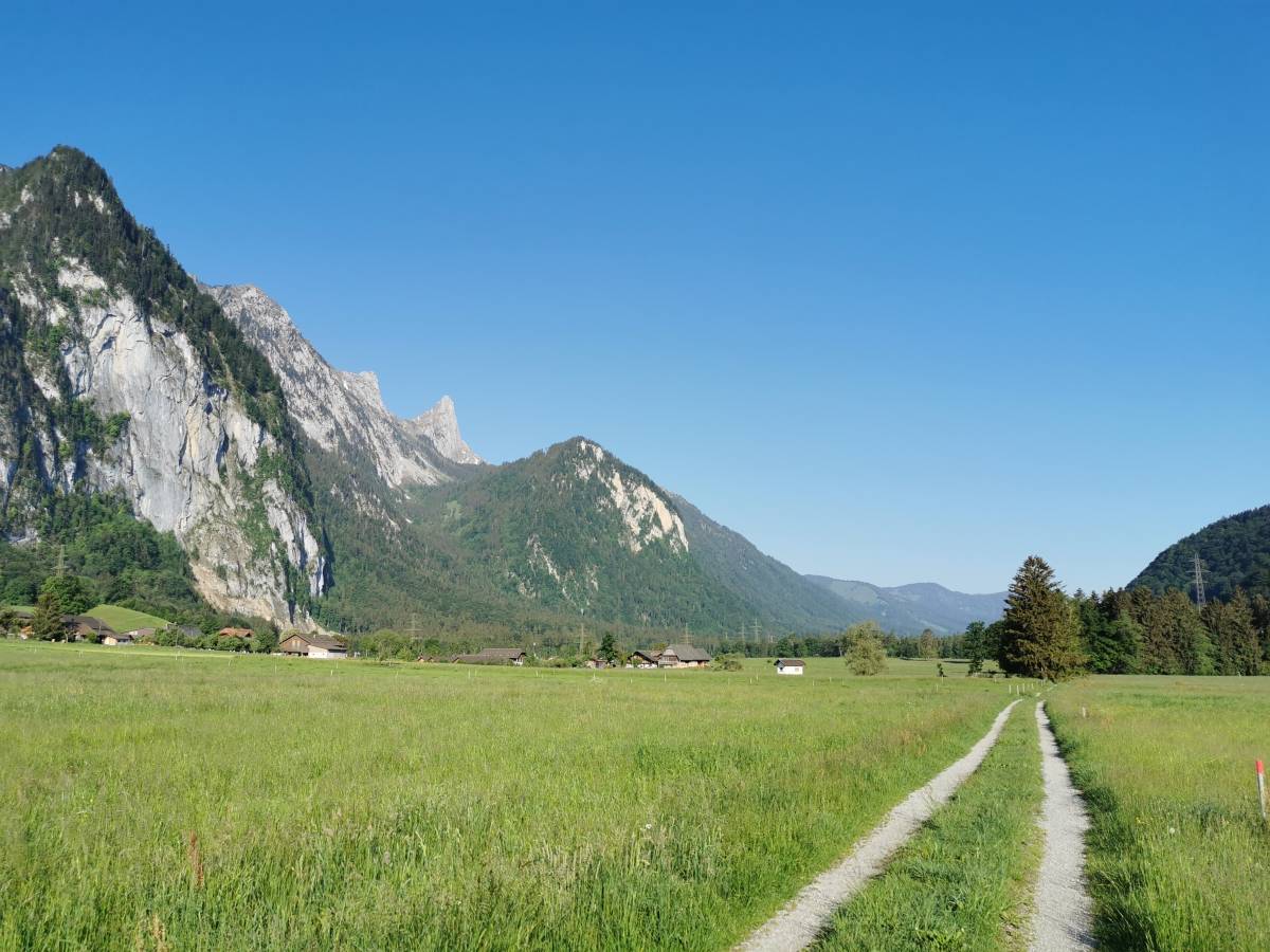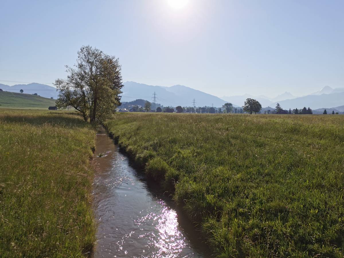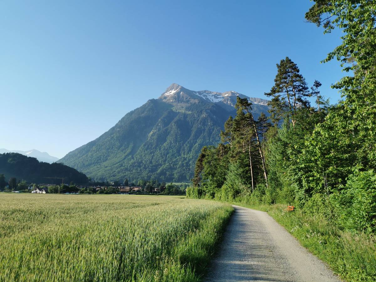 Mit dieser wunderbaren Aussicht vor Augen wandert man über die weite, grüne Ebene. Unterwegs wird der Glütschbach überquert, dessen Wasser vor 300 Jahren nach der Umleitung der Kander in den Thunersee in deren ehemaliges Flussbett abgezweigt wurde, weil die dortige Gegend völlig trockengefallen war.