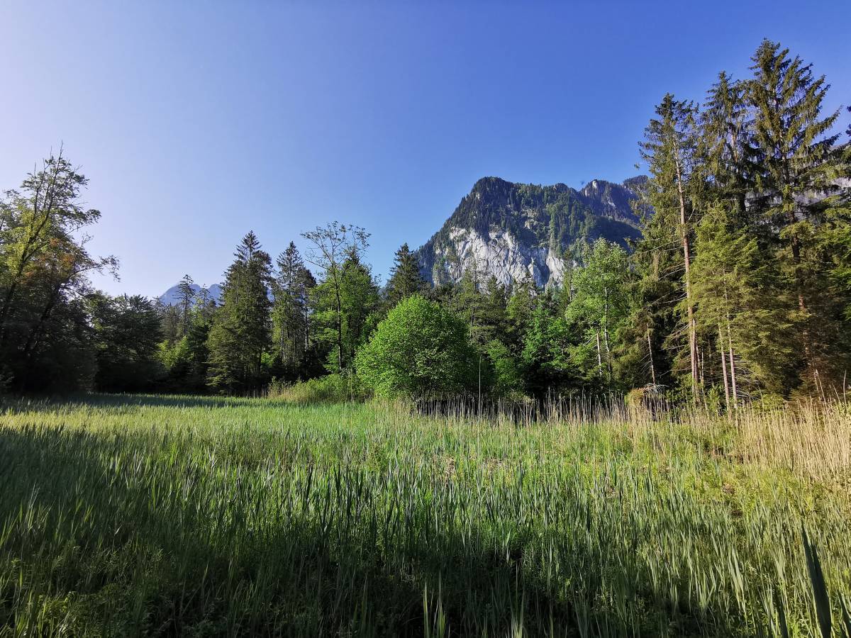 Den Lärm lässt man schon bald zurück. In bezauberndem Kontrast dazu steht die Atmosphäre im Naturschutzgebiet Seeliswald. Feuchtgebiete, kleine Wasserläufe und hohe Tannen bilden ein reizvolles Mosaik. Am Ende des Walds öffnet sich die Sicht zu den Alpen des östlichen Berner Oberlands. Eiger, Mönch und Jungfrau prägen das Panorama, auch die Blüemlisalp setzt einen schönen Akzent.