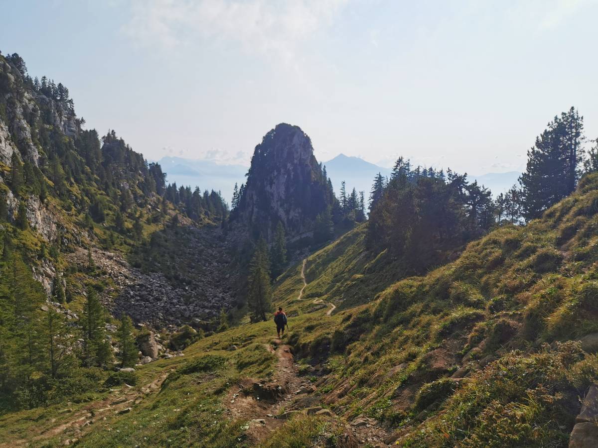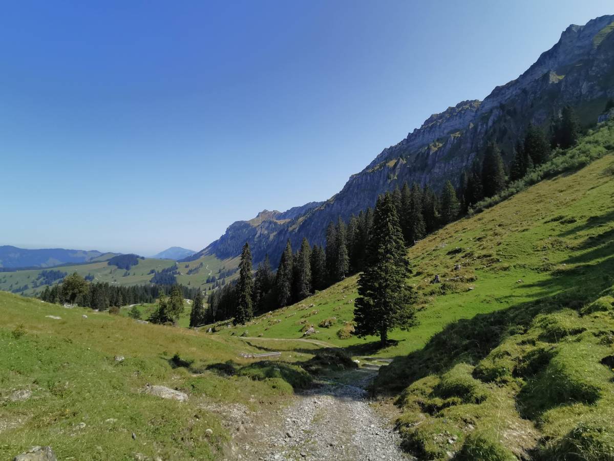 Mächtige Karrenfelder durchziehen den breiten Gratrücken, über den der Abstieg nach Oberbergli verläuft. Bizarr geformte, vom Regen ausgewaschene Kalkfelsen, verwachsene Tannen und kleine Moortümpel prägen das Gesicht der malerischen Karstlandschaft. Senken und Gegensteigungen formen eine abenteuerliche Topografie, in der man ohne die Richtschnur des markierten Bergwegs leicht die Orientierung verlieren könnte.