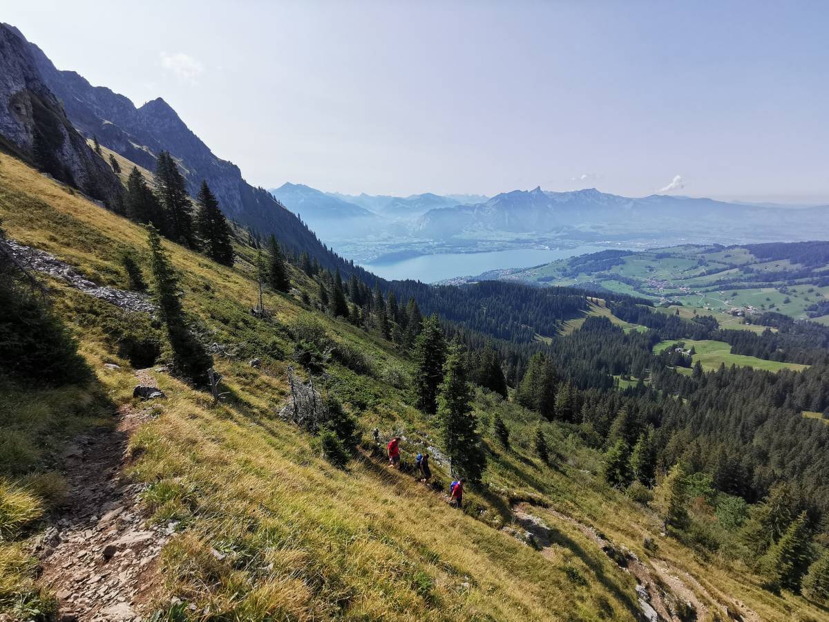 Jetzt wird es sehr steil. Zuerst im Wald, alsdann zwischen zusehends karger werdendem Gebüsch zieht sich ein schmales Weglein im Zickzack den Hang hoch. Zusehends öffnet sich die Sicht zum Thunersee und zur Stockhorn-Gantrisch-Kette, die das weite Aaretal gegen Süden begrenzt.