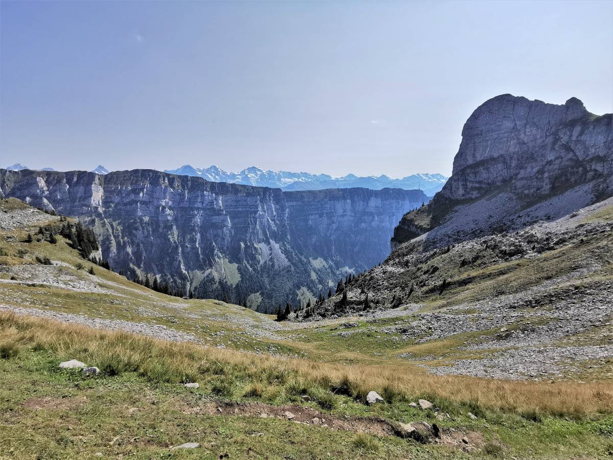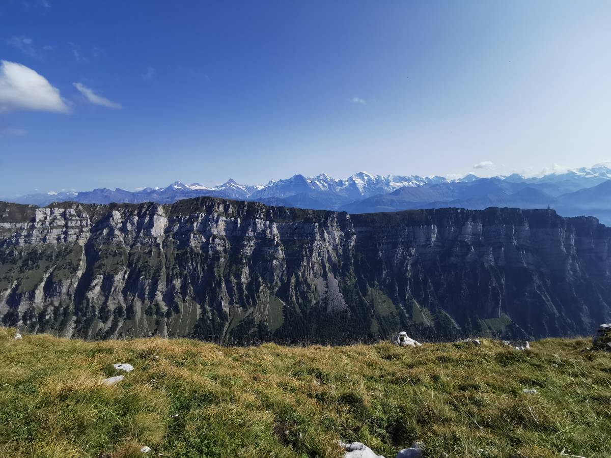 Schliesslich erreicht man den Sigriswilergrat. Wie auf einer Passwanderung wechselt das Panorama auf einen Schlag: Bei der Wegkreuzung Stäpfli/Schafläger öffnet sich die Sicht ins Justistal, darüber ragt der Felskamm von Niederhorn und Gemmenalphorn auf, nochmals ein Stockwerk höher leuchten von fern die schneebedeckten Gipfel der Berner Hochalpen. Finsteraarhorn, Eiger, Mönch, Jungfrau reihen sich zu einer grandiosen Parade aneinander. Im Süden türmt sich eine mächtige Felsknolle auf; sie ist der eigentliche Gipfel des Sigriswiler Rothorns.