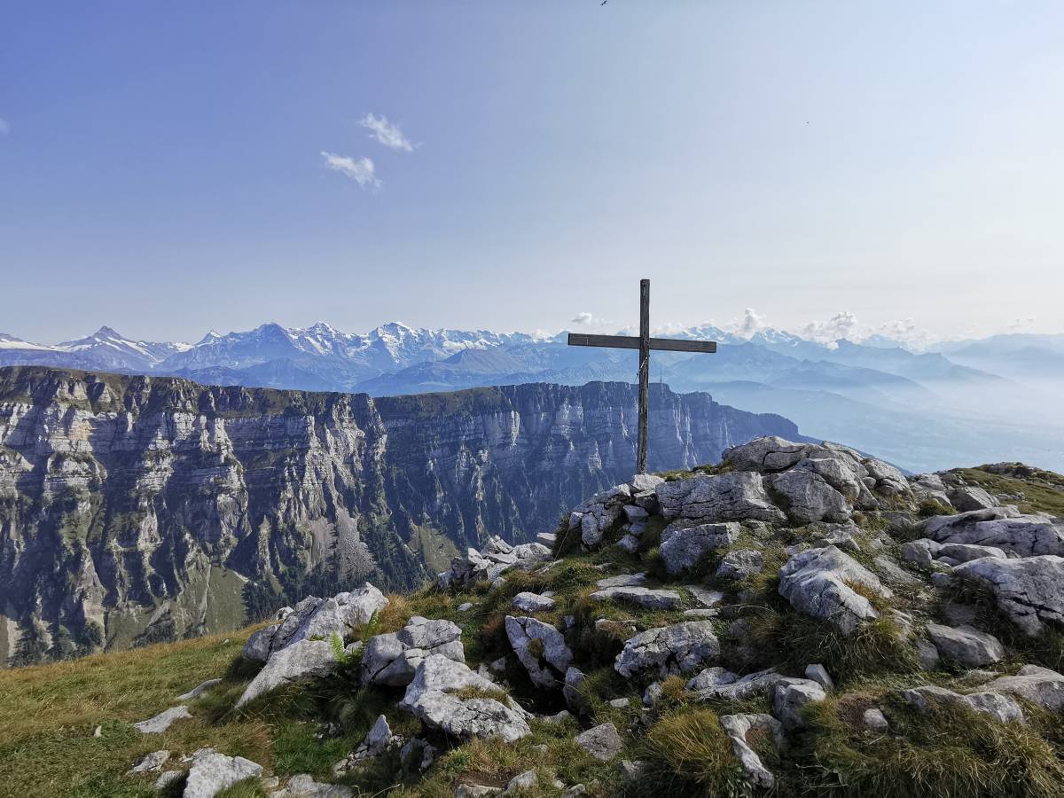 Der höchste Punkt des Sigriswiler Rothorns ist eine ausgedehnte, weitgehend flache Kuppe – ein idealer Ort für eine aussichtsreiche Gipfelrast. Die Rundsicht ist total: Sie reicht von der Sichle im Norden über die Berner Hochalpen, den Niesen und die Gantrischkette bis ins Mittelland und zum Jura.