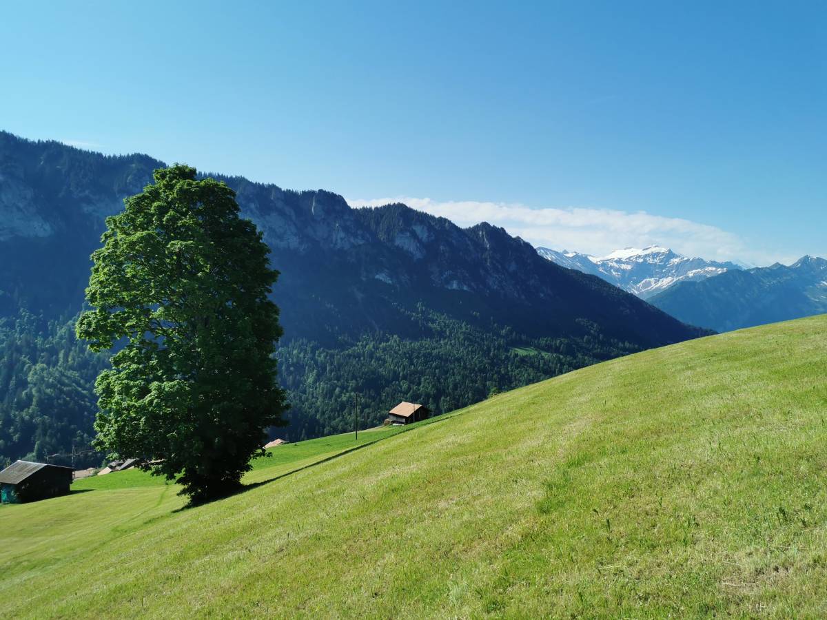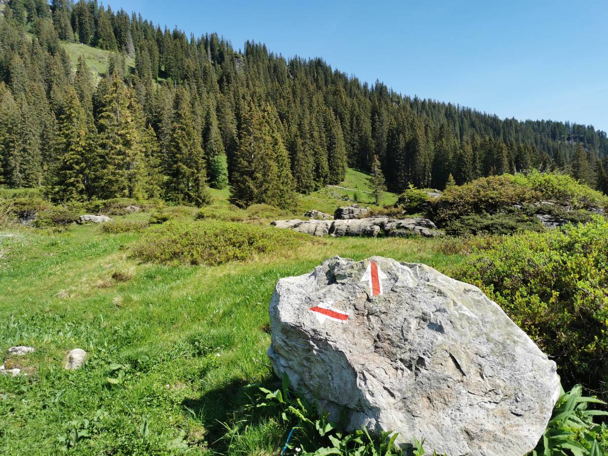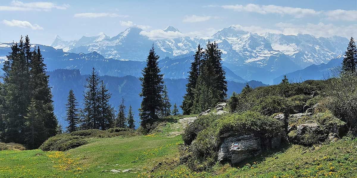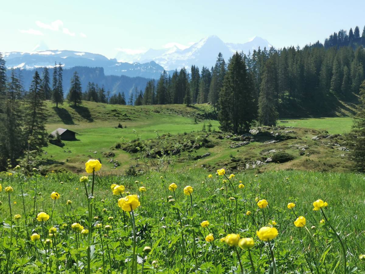 Von der Postauto-Endstation in Habkern marschiert man ein paar Schritte auf der Strasse zurück Richtung Dorf, zweigt dann hangwärts ab und findet sich bereits mitten in blühenden Bergwiesen. Während des Aufstiegs auf einem Grasweg geniesst man eine schöne Aussicht in das weite Tal von Habkern. Ein kurzes Asphaltstück führt nach Allmend/Allmi-Läger. Von dort geht es zunächst auf einem Kiessträsschen, später dann auf schmalen Waldwegen weiter aufwärts zur Chromatte. Der nahezu flache Alpboden ist ein kleines, abgeschiedenes Paradies. Auf den fast ringsum von Wald umgebenen Wiesen blühen im Frühjahr und Sommer unzählige Bergblumen. Über die Wipfel hinweg sieht man Schreckhorn, Finsteraarhorn, Eiger, Mönch und Jungfrau.