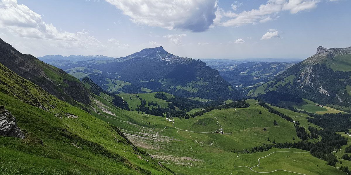 Nach den letzten, sehr steilen paar Dutzend Höhenmeter erreicht man den Sattel des Wannenpasses. Schlagartig öffnet sich die Sicht nach Norden: Hohgant und Schrattenfluh umrahmen eine weite, grüne Arena. Aus der Höhe wirken die Alphütten, die in weiten Abständen auf den Weiden stehen, wie Spielzeughäuser.