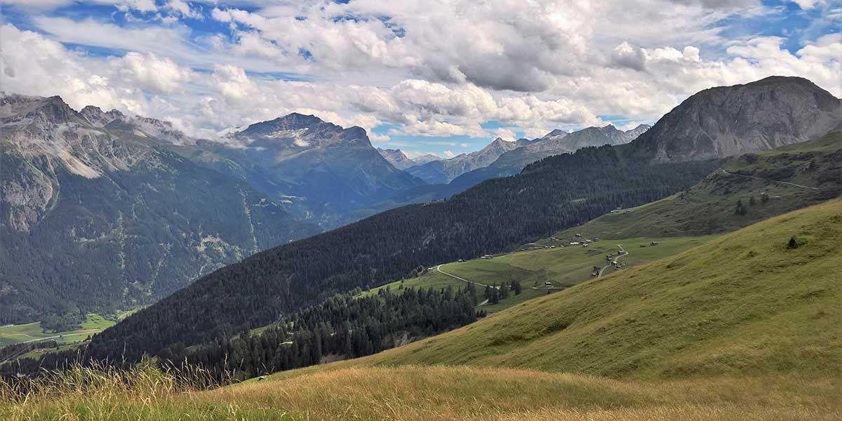 Unterdessen sind die Wanderbeine richtig aufgewärmt, so dass der kleine Zwischenabstieg nach Mursenas ein entspannendes Intermezzo ist. Getrübt wird der Genuss einzig von der etwas unerfreulichen Wegoberfläche: Zwischen zwei betonierten Fahrspuren ist ein schmaler Grasstreifen angelegt – für Wanderer ein wenig geeignetes Trassee.