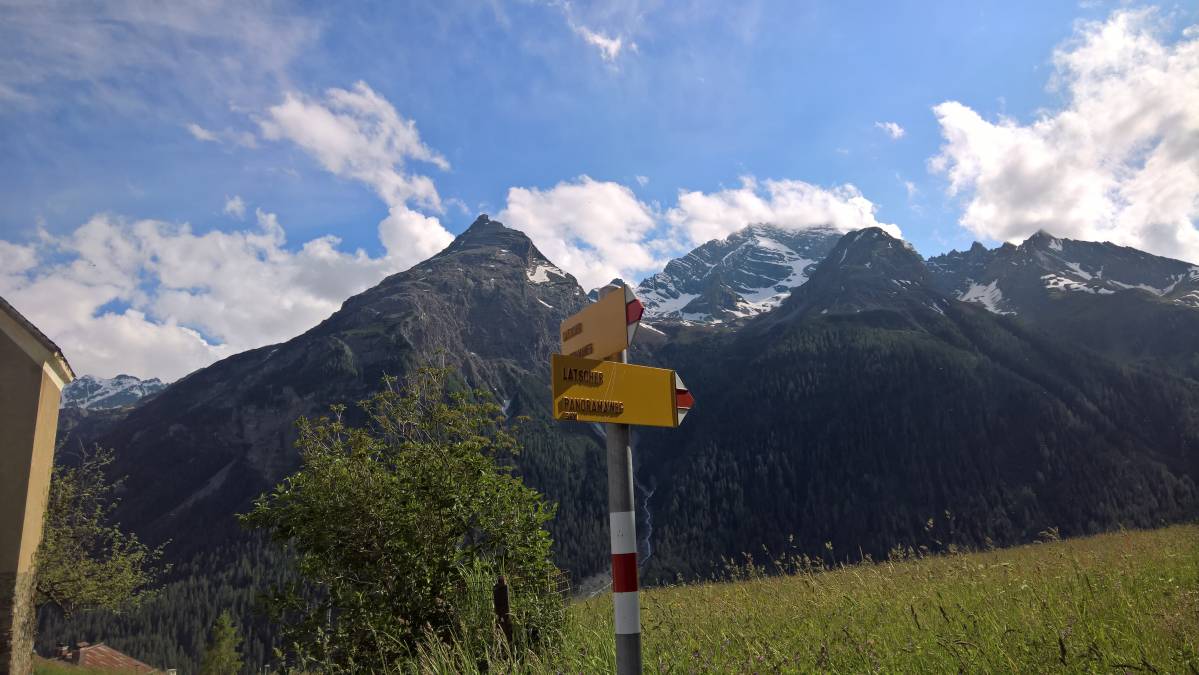 Der Latscher Panoramaweg ist gewiss kein Klassiker unter den Höhenwegen. Die Marschzeit beträgt nur etwa Dreiviertelstunden, auf der Übersichtskarte der regionalen Tourismusorganisation ist er nicht einmal eingezeichnet. Doch das Versprechen in seinem Namen ist nicht zu hoch gegriffen: Wer ihn beschreitet, geniesst ein grossartiges Panorama.