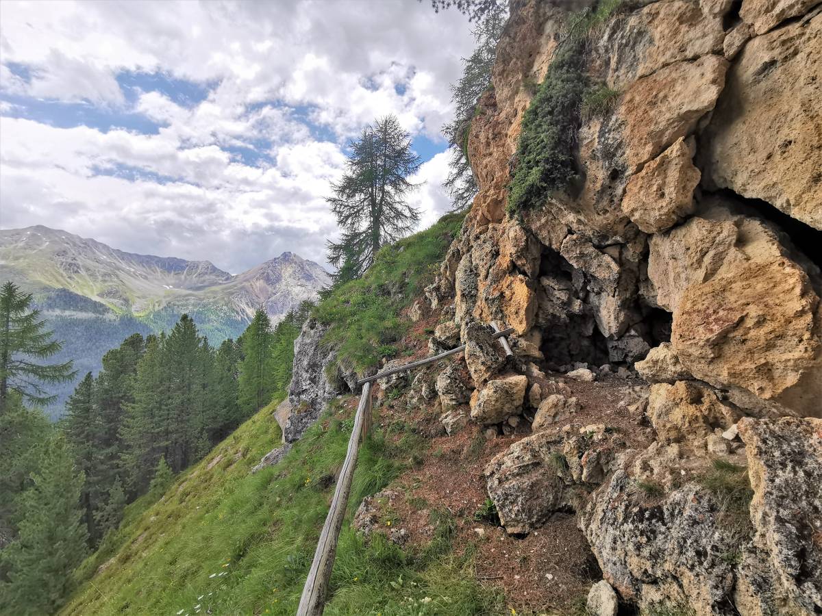 Eine Viertelstunde später erreicht man das Gebiet Cuvel Zoppà und damit den höchsten Punkt der Wanderung. Von jetzt an geht es fast nur noch abwärts oder ebenen Wegs weiter. Eine Tafel am Wegrand informiert über eine verborgene Höhle unterhalb des Bergsees Lai da Juata. Dort wurden Bruchstücke eines Gefässes aus der Hallstattzeit gefunden. Der Zugang zur Höhle ist nicht signalisiert, lässt sich aber ohne Probleme ausmachen: Weglos geht es zum hohen Zaun, der das Alpgebiet vom Wald trennt, und auf einer hölzernen Treppenkonstruktion über diesen hinweg. Das locker bewaldete Gelände jenseits des Zauns ist sehr steil (Vorsicht!), ein schmaler Pfad erleichtert jedoch den Abstieg zur etwa 40 Meter tiefer liegenden Höhle. Das Gewölbe ist teilweise eingestürzt, bietet aber immer noch einen guten Eindruck von den einstigen Dimensionen der Grotte.