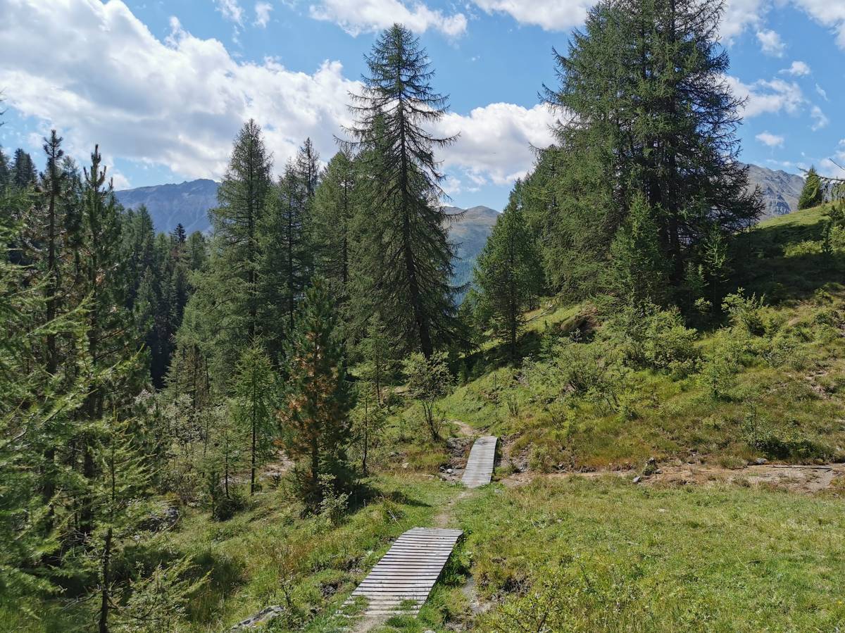 Sanft absteigend geht es auf einfachen Bergwegen über Weideland zur Alp Champatsch. Von dort führt ein schmales Weglein zunehmend steil ins Tobel der Aua da Laider. Nachdem man den Bergbach überquert hat, gelangt man praktisch ebenen Wegs zunächst durch dichten Tannen-, später durch lichten Lärchenwald nach Lü, einer der höchsten ganzjährig bewohnten Siedlungen der Alpen. Unterhalb des Dorfs verläuft die Wanderung für etwa 600 Meter der Strasse entlang – es ist dies der einzige nennenswerte Abschnitt auf Hartbelag dieser Tour. Danach geht es abwechslungsweise auf schmalen Pfaden, Kiessträsschen und Waldwegen kurvenreich den Hang hinunter, mal im Bergwald, dann wieder auf Weideland und über Mähwiesen. Bei Verzweigungen hält man sich einfach an die in Richtung Valchava signalisierten Wege. Der letzte Abschnitt der Wanderung führt dem Talflüsschen Rom entlang nach Muglin und von dort ins Dorfzentrum von Valchava.