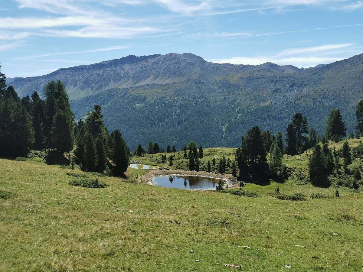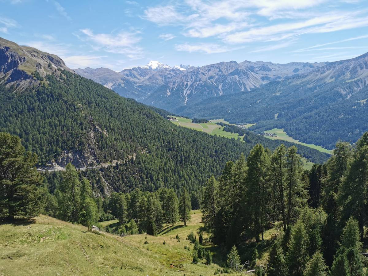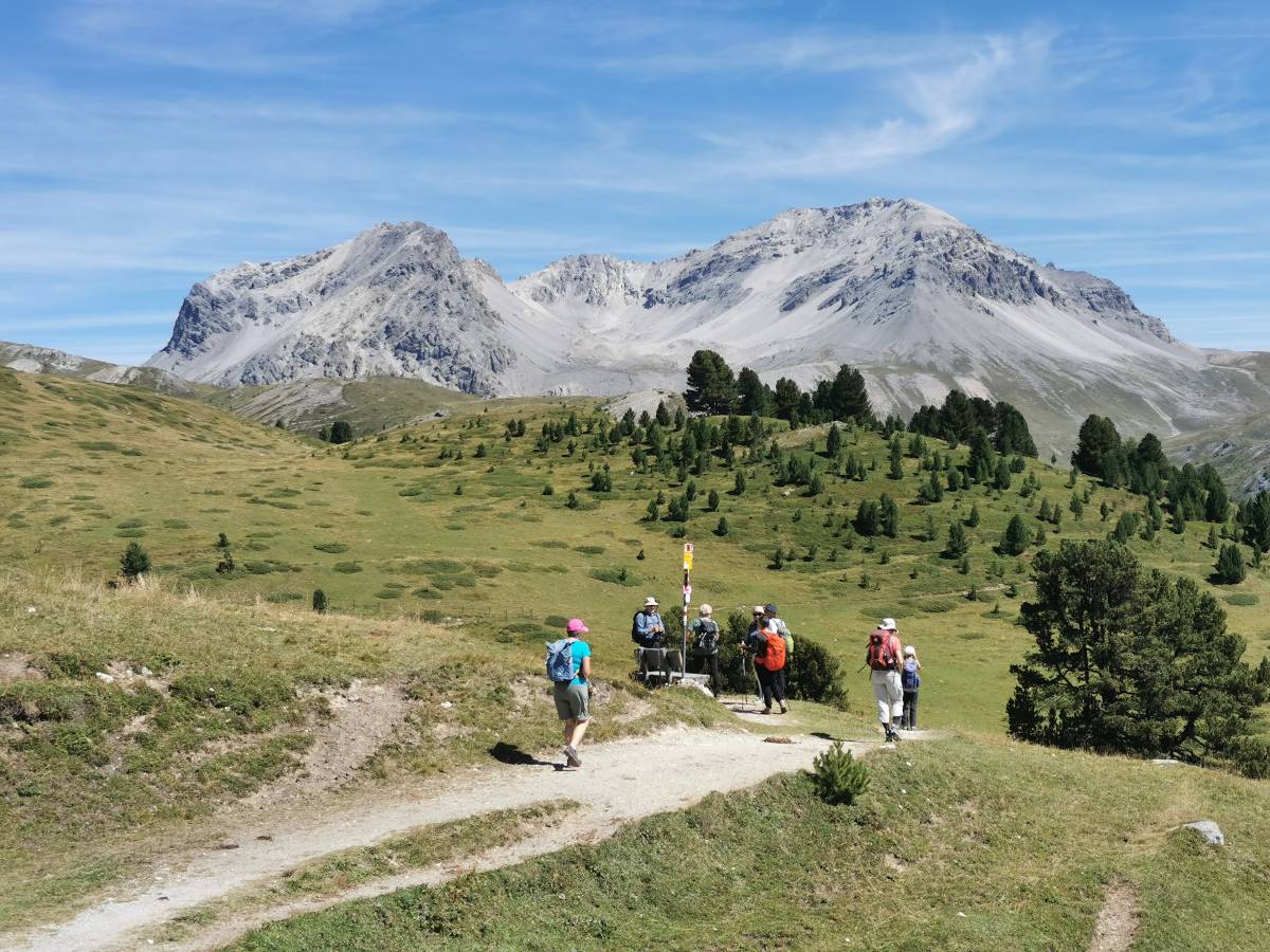 Süsom Givè, so heissen die Haltestelle und das Restaurant auf der Passhöhe (die exotisch klingende Ortsbezeichnung bedeutet auf Deutsch «unter der Schulter»). Hier beginnt die Wanderung, die zunächst der nördlichen Talflanke des Val Müstair entlang verläuft und dann hinunter in den Talboden führt. Der Einstieg liegt auf der Ostseite der Passstrasse. Durch lichten Bergföhrenwald geht es leicht aufsteigend auf die weite Hochebene Plaun da l’Aua, die eine sehr schöne Aussicht zu den umliegenden Bergen bis zur gletschergekrönten Kuppe des Ortlers bietet. Von nun an bis Lü verläuft die Tour als Höhenwanderung mit immer wieder wechselnden Tiefblicken ins Tal.