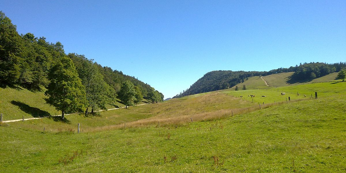 Welschenrohr liegt zwischen der ersten und der zweiten Jurakette. Um Alpensicht zu erlangen, heisst es somit in die Höhe zu steigen. Vom Dorfzentrum führt ein Strässchen hangwärts, das bald in einen breiten Waldweg übergeht, der sich nach einer Weile zu einem schmalen und ansehnlich steilen Pfad verengt. Die Kühle des Waldes sorgt dafür, dass der Aufstieg zu keiner sonderlich schweisstreibenden Anstrengung verkommt. Oben auf der Krete stellt sich dann unvermittelt ein Pass-Feeling ein: Jäh öffnet sich die Sicht auf das Mittelland und zur Alpenkette.