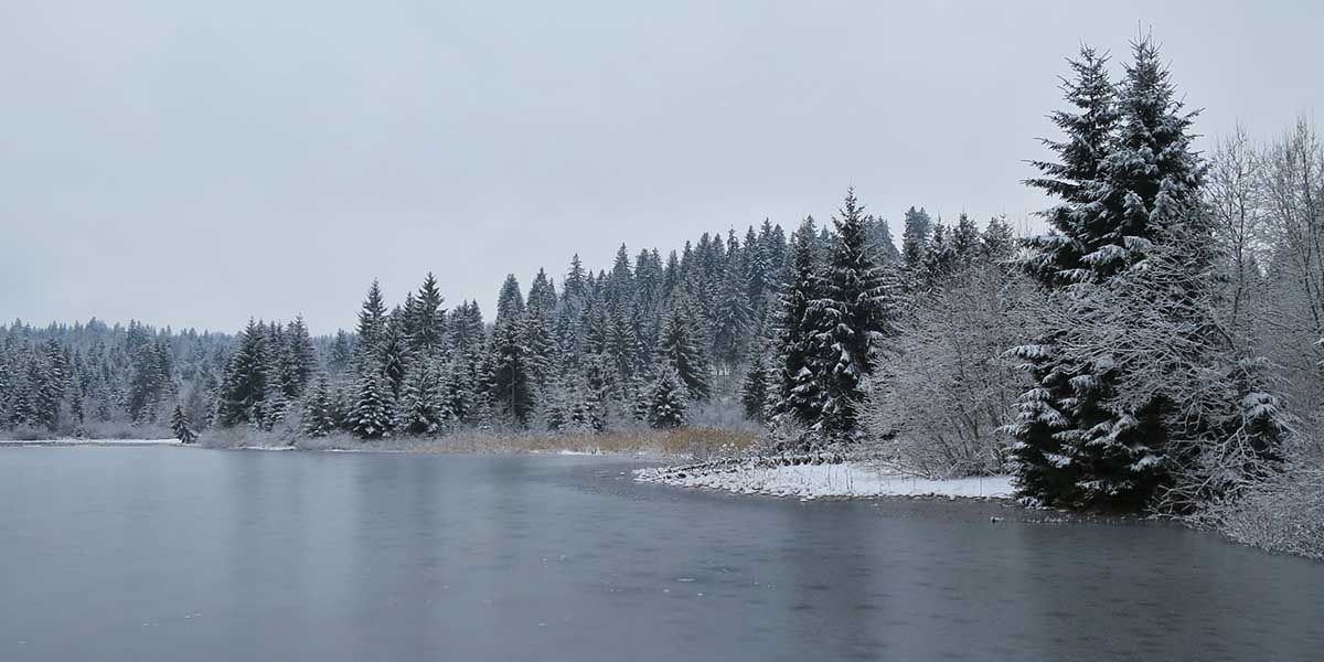 Der Etang des Royes offenbart je nach Temperatur und Schneeverhältnissen ein ganz unterschiedliches Gesicht: Er kann sich als dunkler Spiegel aus schwärzlich schimmerndem Eis zeigen, aber auch als flächige Leere von blendendem Weiss. So oder so bietet der von Wald umgebene See einen sehr reizvollen Anblick. Die Schneeschuhroute verläuft ab jetzt streckenweise auf dem Trassee des gelb markierten Wanderwegs, der Richtung Saignelégier führt. Zwischendurch zweigt sie aber immer wieder davon ab und nimmt ihren eigenen Lauf.