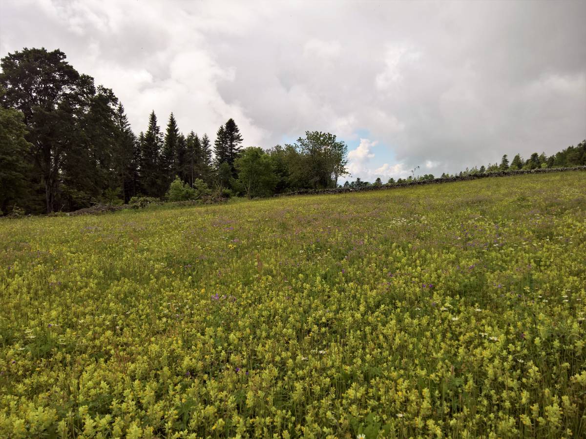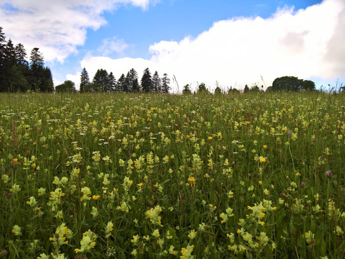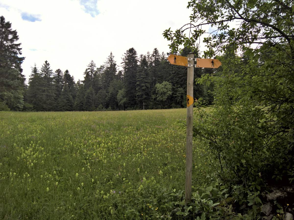 Ohne nennenswerte Höhendifferenzen geht es über den Chasseral-Ausläufer voran. Über Les Trois Cheminées gelangt man zur Ferienhaussiedlung Petit Chaumont. Die Wanderweg-Signalisation ist hier etwas lückenhaft: Es geht weder links noch rechts auf dem Strässchen weiter, sondern geradeaus auf einem kaum sichtbaren Wiesenpfad.