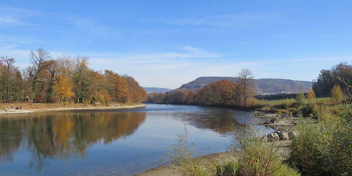 Wasser an allen Ecken und Enden: Im Raum Brugg beschreibt der Aare-Uferweg merkwürdige Schlaufen und verschlungene Linien. Grund dafür ist der Zusammenfluss von Aare, Reuss und Limmat in der reizvollen Landschaft des sogenannten Wasserschlosses. Ausserhalb des Siedlungsgebiets kaum Hartbelag.