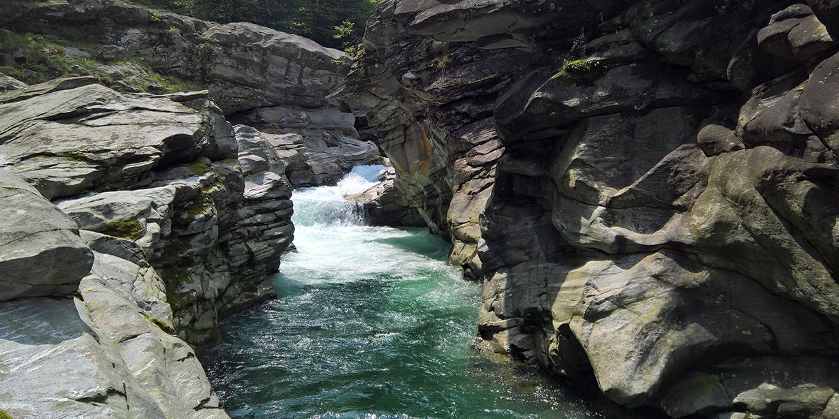 Erneut wird der Fluss auf einem festen Steg überquert. Wer Zeit hat und Abenteuerlust verspürt, folgt vorher dem Wasserlauf auf einem schmalen Pfad während einigen hundert Metern flussabwärts. Der Isorno hat hier eine paradiesisch schöne Landschaft von geschliffenen Felsplatten, Stromschnellen, kleinen Wasserfällen und breiten Becken geschaffen, in denen das frische Bergwasser träge dahinfliesst.