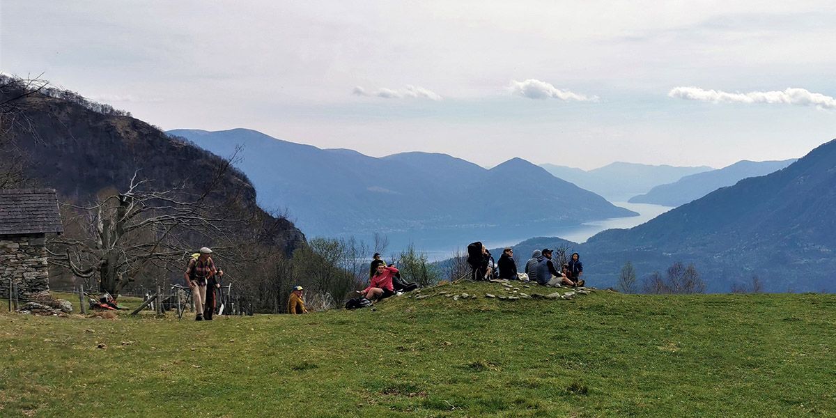 Nach dem langen, gleichförmigen Aufstieg im Wald erinnert dieser Übergang an das Eintauchen in einen fantastischen, farbenfrohen Traum. Erst recht Anlass dafür, sich verwundert die Augen zu reiben, gibt es einige Schritte weiter vorne, wo sich ein kolossales Naturbühnenbild entfaltet: Zwischen dem Gambarogno und dem Pizzo Leone zieht sich der Lago Maggiore in erhabener Gelassenheit gegen Italien hin.