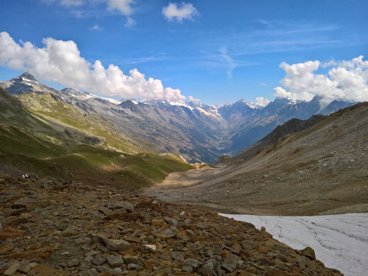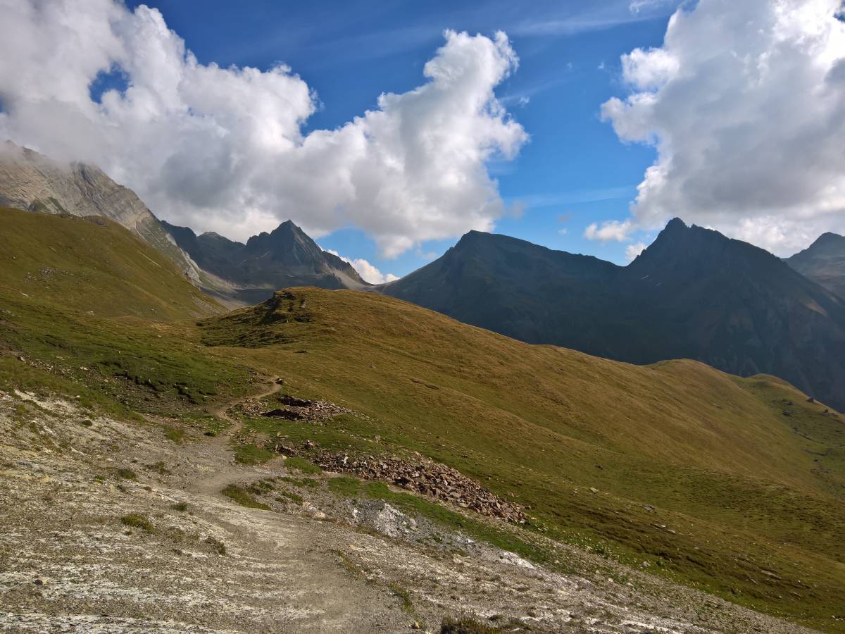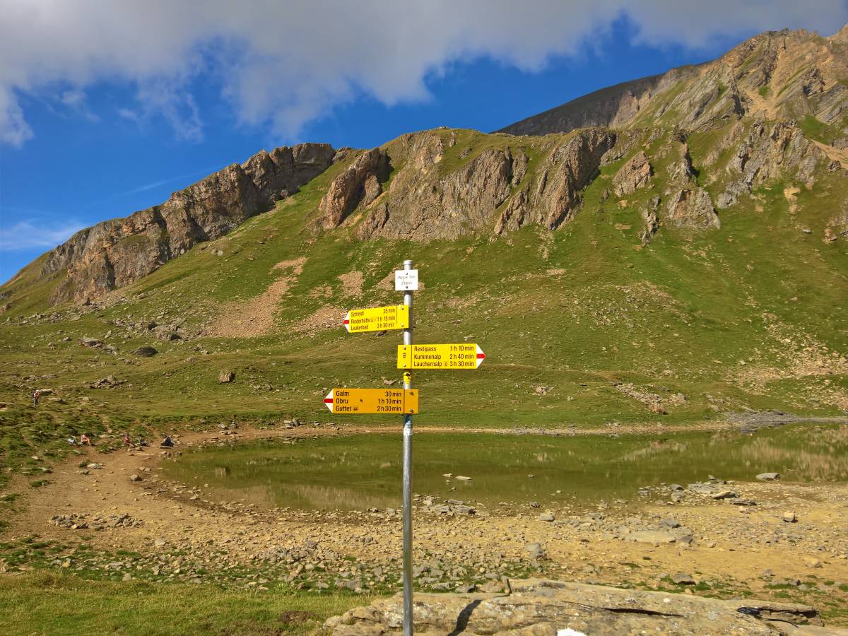 Kaum merklich geht es aufwärts, immer einsamer wird die Gegend. Bei der Geländerippe Schnydi schwenkt man in einen weiten, wilden Gebirgskessel ein und erreicht die Mulde des Wysse See. Anschliessend geht es erst leicht abwärts, aber schon bald ziemlich steil aufwärts. Immer karger wird die Vegetation. Mehrere steinige Runsen kreuzen den Weg. Von weitem hat sich der Restipass als perfekt gerundeter Geländeeinschnitt gezeigt. Vor Ort erweist er sich als ausgedehntes, praktisch flaches Geröllfeld.