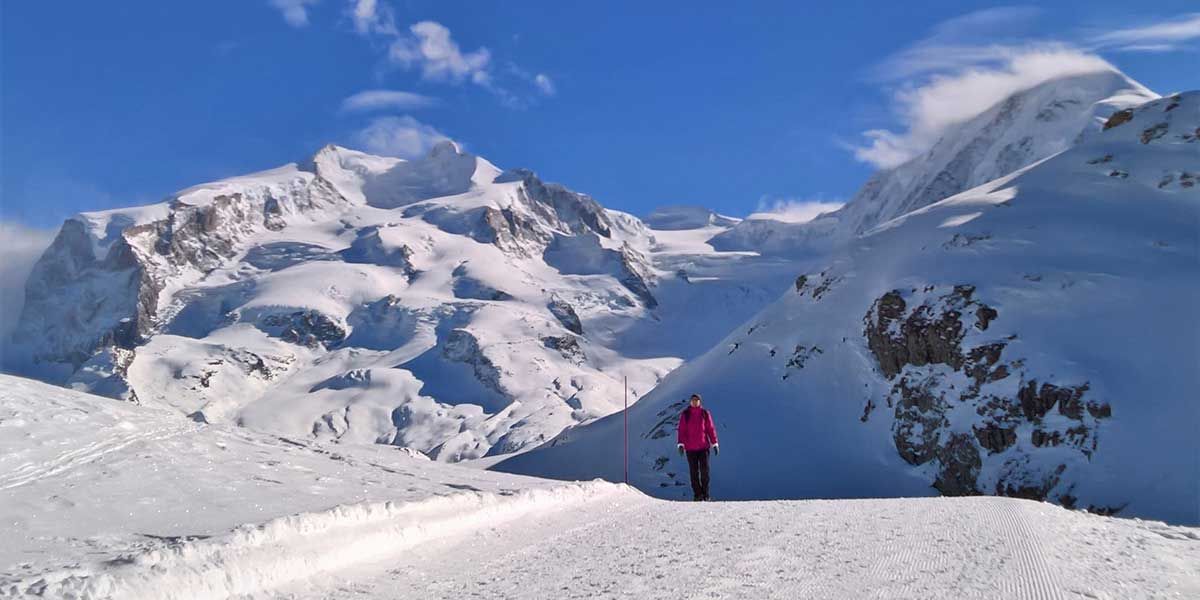Die Strecke verläuft zum grossen Teil abseits des Pistengebiets. Entsprechend eindrücklich ist die Stille und Einsamkeit, die einen umgibt. Hinzu kommt ein Panorama der Extraklasse: Zu Beginn geniesst man eine grandiose Sicht hinüber zum Matterhorn, dem wohl bekanntesten Gipfel Europas (wenn nicht der ganzen Welt). Nach einer Weile öffnet sich gegen Osten die Sicht auf den Monte Rosa. Für den Betrachter, der einen Moment vergisst, wie hoch er sich bereits befindet, mag die Gipfelgruppe wie ein harmloses Dreitausender-Ensemble aussehen. Dabei ist der markante Zahn, der die übrigen Felshöhen überragt, der höchste Punkt der Schweiz: Die 4634 m hohe Dufourspitze scheint zum Greifen nah – und liegt doch immer noch gut zehn Kilometer entfernt.