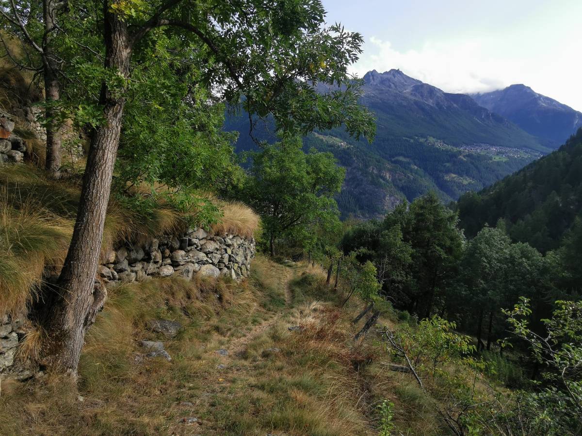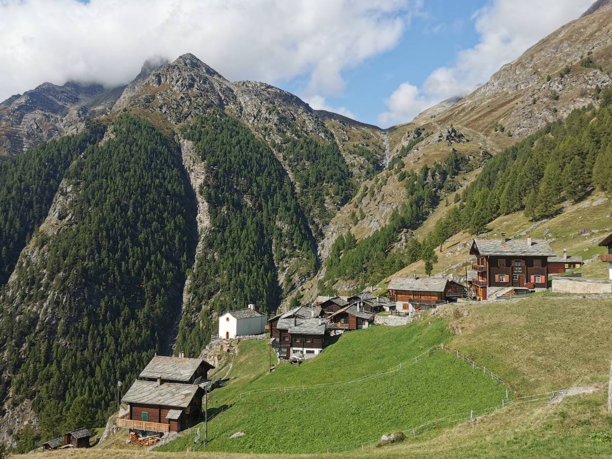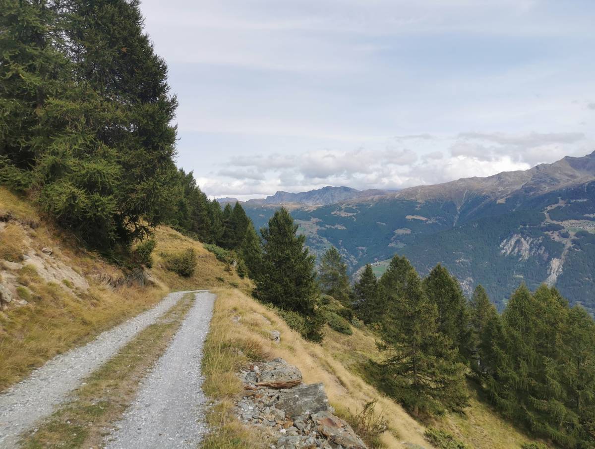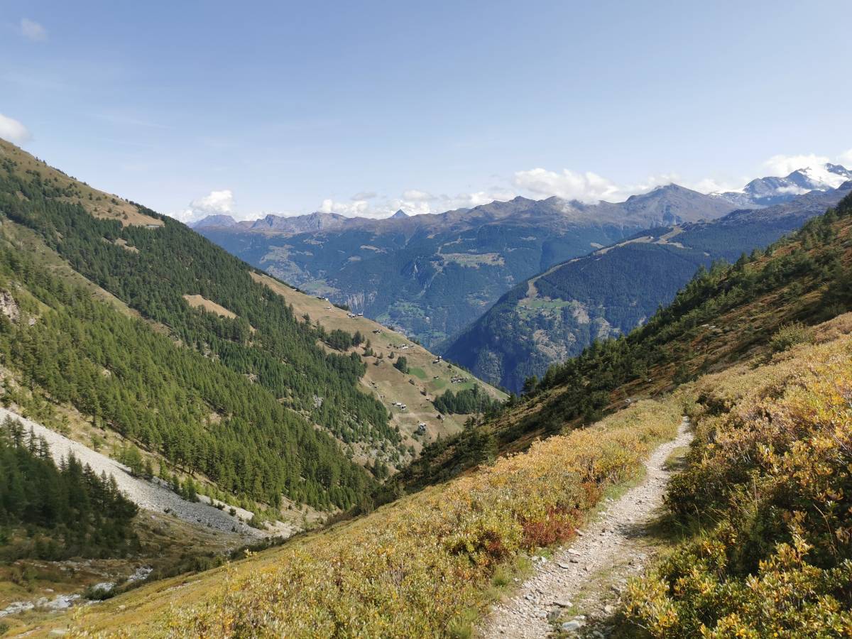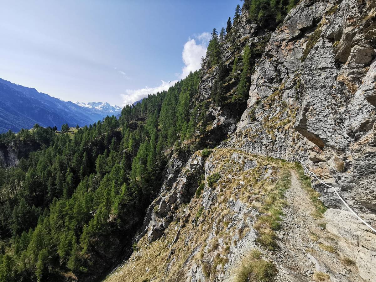 Die Wanderung wird von einem Aufstieg eingeleitet, der zunächst über Weideland und durch Wald führt, dann durch felsiges Gelände und schliesslich entlang einer schroffen Felswand. Wer einigermassen schwindelfrei ist, wird auf der etwas ausgesetzten Passage keine Schwierigkeiten haben: Das Trassee ist recht breit, zudem ist hangseits ein Seil am Fels angebracht. Es lohnt sich, zwischendurch stehenzubleiben und das Panorama auszukosten. Auf der gegenüberliegenden Talseite liegt das Feriendorf Grächen; darüber breitet sich ein Gipfelkranz aus, der mit dem Seetalhorn, dem Gabelhorn und anderen stattlichen Dreitausendern beginnt und gegen Süden hin zum Dom und weiteren Viertausendern kulminiert.