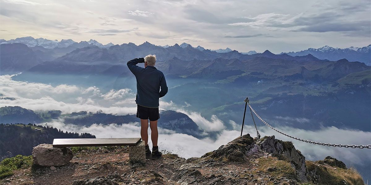 Oben auf der Kuppe erwartet einen eine fabelhafte Rundsicht von der Alpenkette im Süden bis ins Mittelland mit der Stadt Zürich. Im Dunst der Niederungen erkennt man auch die Gegend von Seelisberg und damit den Standort, den seinerzeit Ernst Hodel einnahm, als er sein Panoramabild schuf. Man ist nun dort angekommen, wo einen das im Bahnhof Basel SBB ausgelöste Fernweh hingezogen hat.
