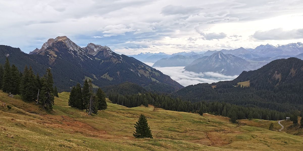 Vorbei an den Hütten der Alp Ällgäu steigt man nach Rischigenmatt ab. Von dort führt ein Alpsträsschen direkt nach Lütholdsmatt zurück. Zu Beginn ist es mit Kies gedeckt, ab Fachsboden dann mit Asphalt, was nochmals einen gut einstündigen Marsch auf Hartbelag ergibt. Doch es gibt Besseres: Ein schmaler Pfad führt von Rischigenmatt durch eine märchenhafte Moorlandschaft zum Langenfeldmoos. Von dort geht es zwar ein Stück weit ebenfalls auf einer Kiesstrasse voran, doch bei Schwand zweigt man bereits wieder auf Weideland ab und gelangt zur Schwandschlieren hinunter. Auf der anderen Seite des Wildbachs geht es sehr steil aufwärts nach Schlorpen und weiter zur Wegkreuzung Rossstand, wo ein gut ausgebauter Rastplatz samt Feuerstelle zur Verfügung steht. Von da geht es, vorerst sanft absteigend erneut auf einem Kiessträsschen, dann etwas steiler auf einem Waldpfad, weiter Richtung Stock. Ein kurzer Aufstieg über Weideland zur Alp Lütholdsmatt schliesst die sehr abwechslungsreiche Rundwanderung ab.